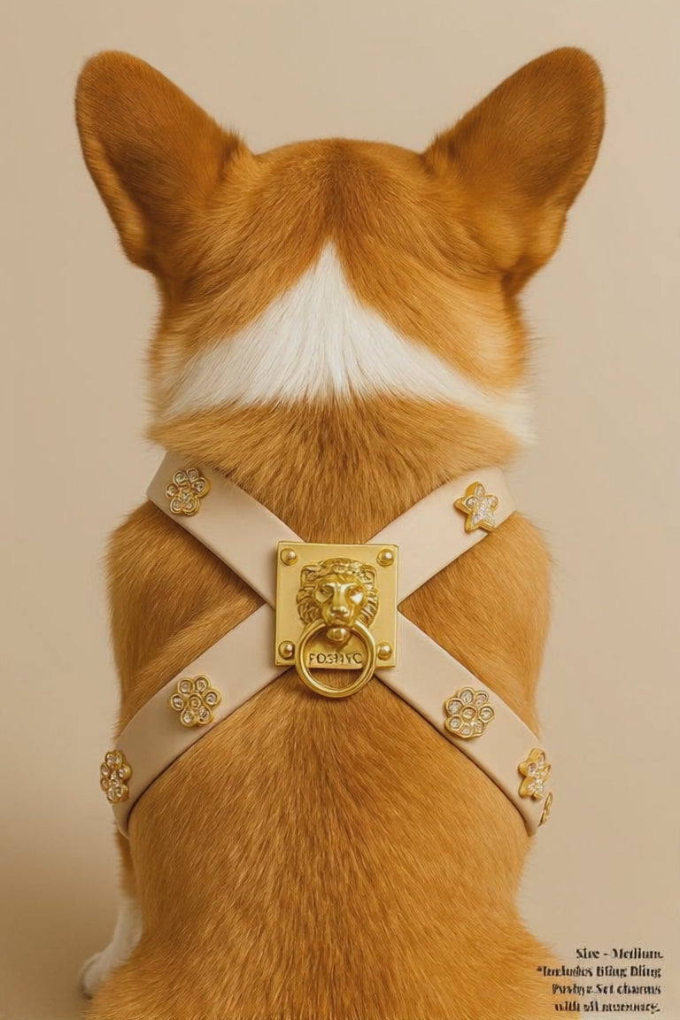 No te pierdas este diseño exclusivo de POSHYC con un emblema de cabeza de león dorado. Prepárate para encender la imaginación y hacer sonreír con nuestra querida Colección ClipUp. ¡Haga de cada caminata una aventura con el arnés cruzado ClipUp elegante, funcional y personalizable!